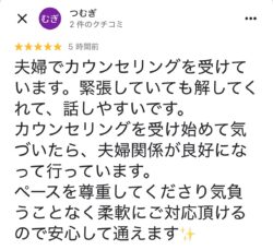 「 夫婦でカウンセリングを受けています。緊張していても解してくれて話しやすいです。 」